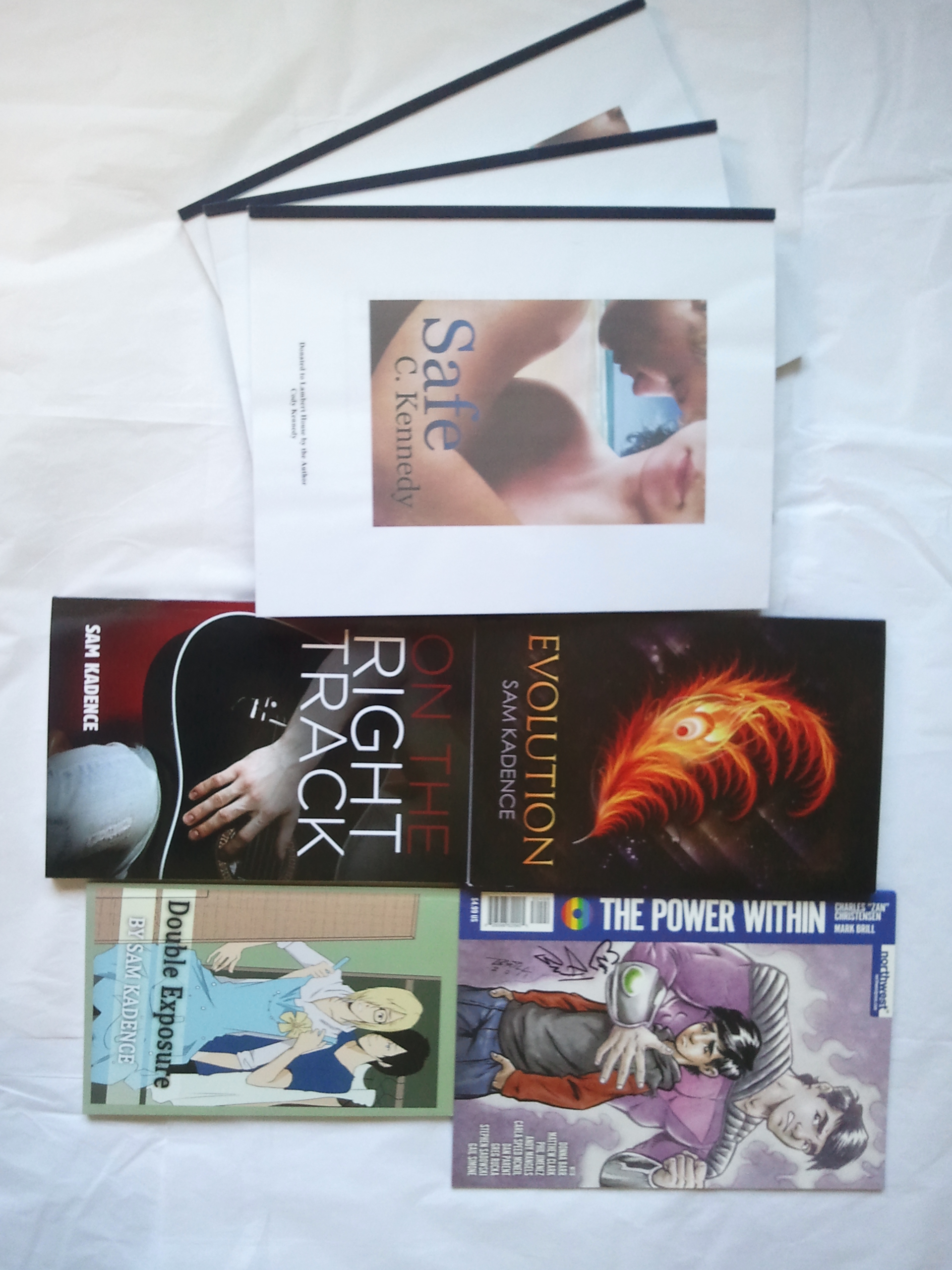 A big thank you to T for this donation, and to author Sam Kadence who donated the YA novels Evolution, On the Right Track, and Double Exposure, and to author Cody Kennedy, who sent three copies of the new YA novella Safe, Thank you, T, Sam, and Cody!