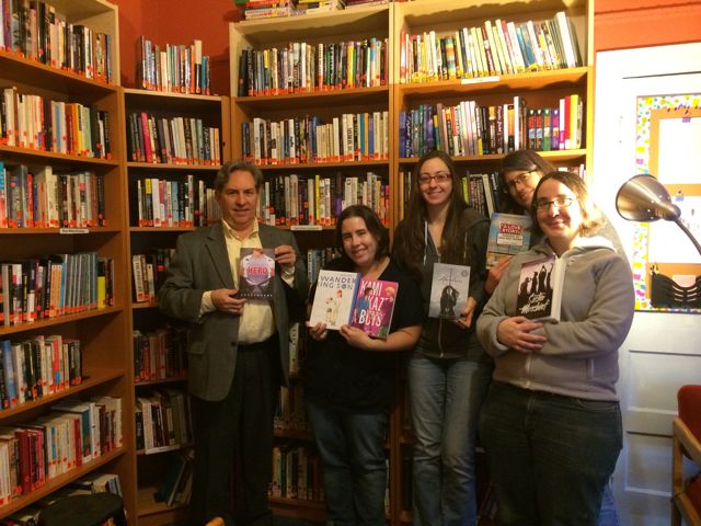 Lambert House Executive Director Ken Shulman and GRNW Volunteers hold up some of the new YA LGBT books for the Lambert House library.